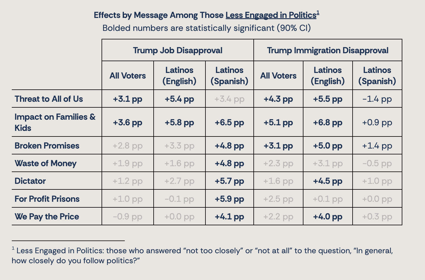 Across languages and subgroups, the most effective message for lowering Trump approval overall and on immigration is focused on the impact of the administration’s actions on families and children. We recommend continuing to amplify stories of overreach as proof points.